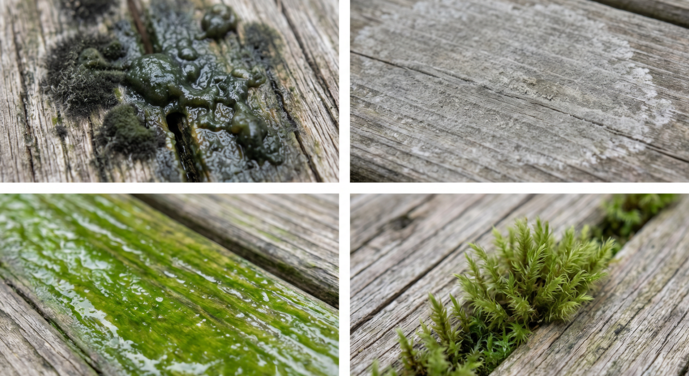 Algae appears as a slick, green or yellow film. Unlike mold, algae is a plant and feeds on sunlight and moisture, not on the wood itself. Most common on shaded, north-facing decks.