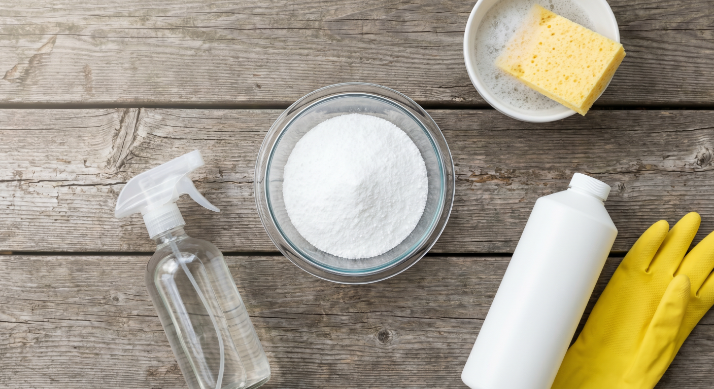 White vinegar - for light surface mold only. Vinegar can kill light surface mold but cannot penetrate deep mold in porous wood. Mix equal parts vinegar and water. Best for sealed wood or capped composite.