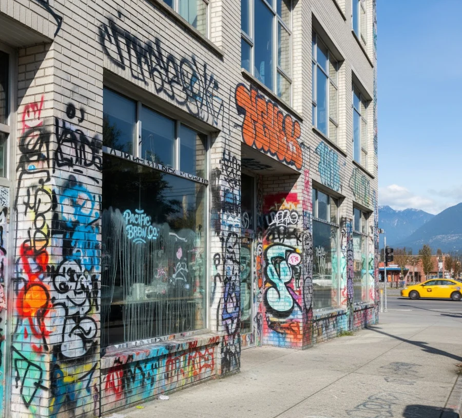West End graffiti removal addresses Vancouver's densest neighborhood where tagging affects Davie Street retail, Denman restaurants, and English Bay access points. We remove spray paint from high-rise glass facades, heritage walk-up apartments, and underground parkades. 2-hour emergency graffiti response for tourist-facing businesses.